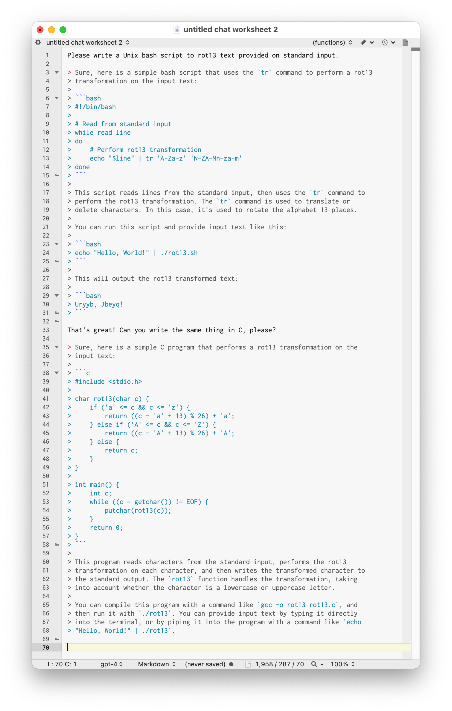 BBEdit 15’s joins BBEdit’s unique “worksheet” interface to ChatGPT, Claude, and Ollama so that you can have conversations right in BBEdit itself — no application switching or awkward copy/paste from a web browser. Each chat worksheet that you create maintains its own history, so that you can easily refer back to past conversations, or keep a conversation going across an extended period of time.