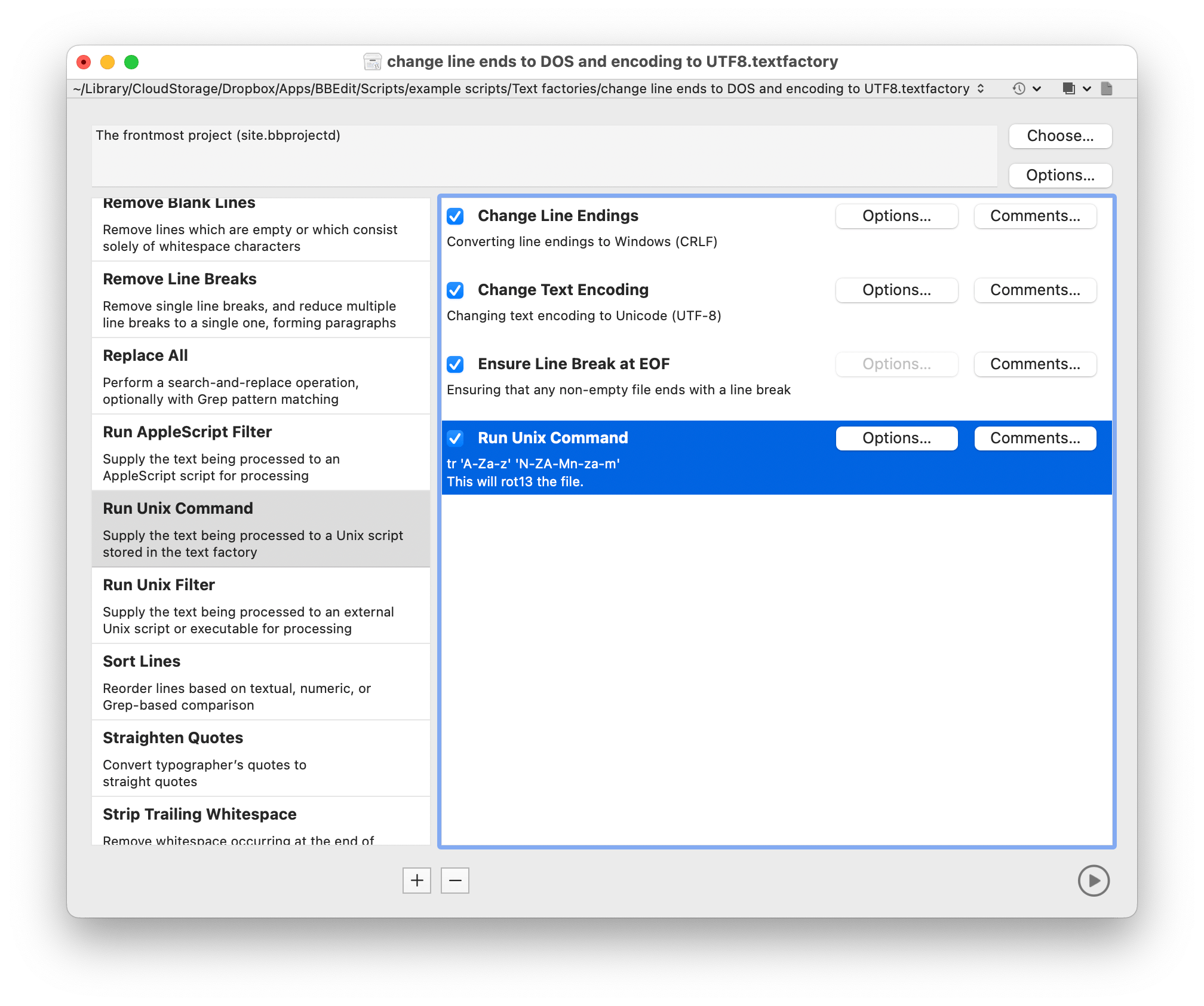 BBEdit’s unique “Text Factory” feature has been reimagined for version 15. All available transformations are listed for easy access, and assembling a factory requires fewer steps. A new “Run Unix Command” operation improves factory portability by storing the Unix command in the factory itself.
