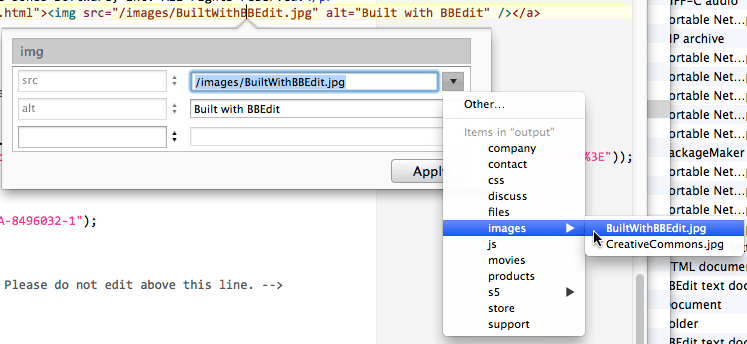 The markup panel is driven by the same information that informs BBEdit’s markup syntax checker, so that it shows you tags, attributes, and attribute values that are appropriate for the point in your document in which you’re editing.