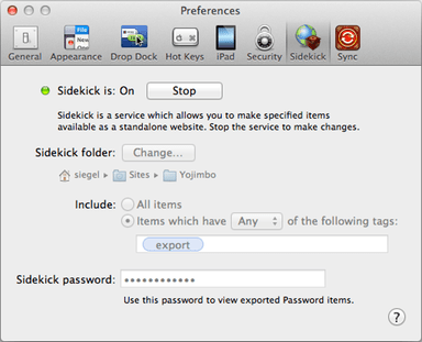 Go to the Sidekick section in Yojimbo’s preferences, and click the “Start” button. That’s it! You can export all of your stored data, or only items which match specific tags which you designate.