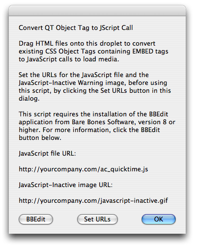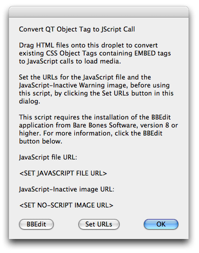 This page contains information about, and a download link for, an AppleScript droplet which automates the process of updating HTML pages containing QuickTime content. The script uses BBEdit to automatically open, scan, and edit all HTML files dragged onto its icon, replacing <object> tags containing <embed> tags with JavaScript calls to load the QuickTime content referenced in the replaced tags.