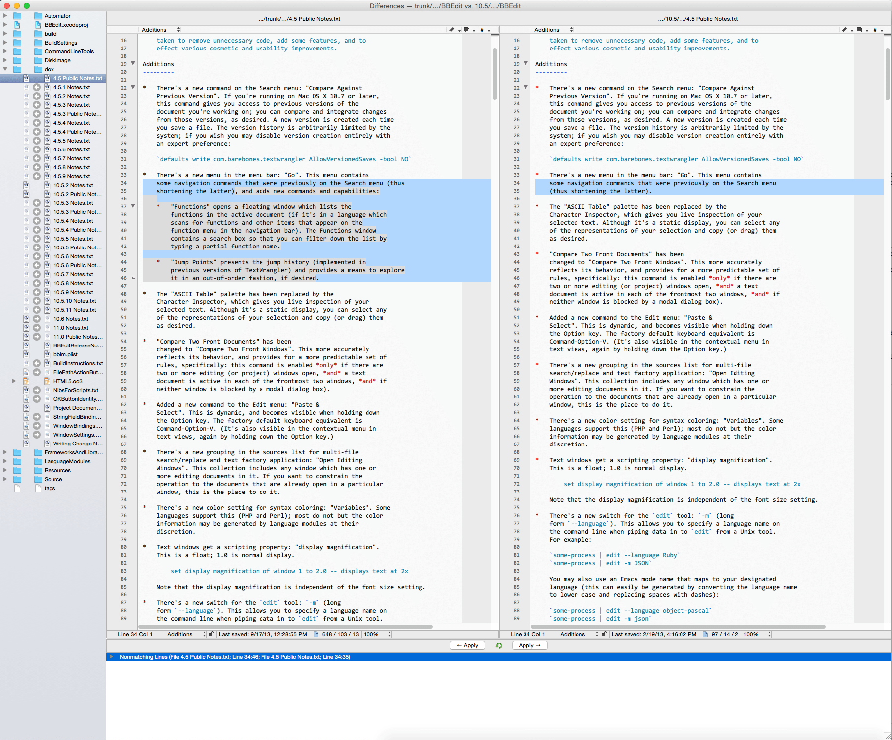 - New UI for Find Differences - The “Find Differences” dialog box has been modernized, and folder comparisons are faster than ever, thanks to a rewritten and newly performance-tuned comparison engine. The most significant changes are in the results interface, however: an all-new single window presentation is much easier to use for folder comparisons, is easier to manage, and (for folder comparisons) provides the ability to copy files as needed from one folder to another.
