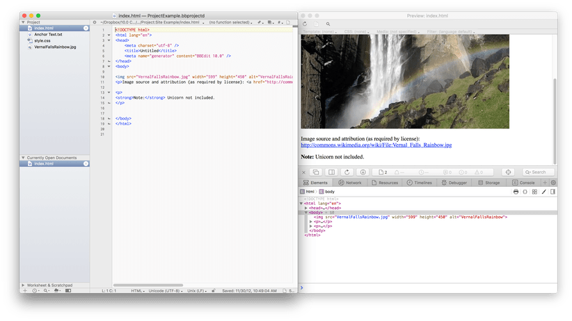 The “Preview in BBEdit” command uses WebKit (the same engine that powers Safari, Google Chrome, and other popular web browsers) to preview your code. The preview window updates your window as you edit, without requiring you to save, reload, or switch applications. If you wish, you may use any available Web browser for previewing as well. New BBEdit preview windows now include access to the powerful WebKit Inspector, so that you can inspect the runtime behavior of your page, debug JavaScript on the fly, and more.